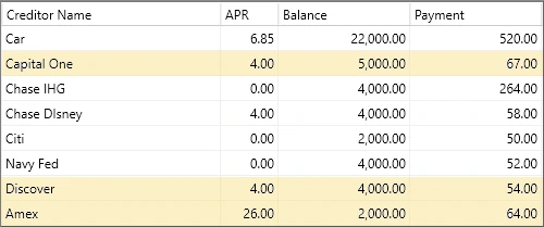 I ran two scenarios: Avalanche (highest APR first) and Snowball (smallest balance first).